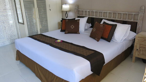 The apartments are considerably larger than the normal hotel rooms. The fourth and fifth floors, ‘A’ block location are away from the lifts and offer relative quiet from the passing traffic of ground level rooms. From the private balcony the main street views offer an interesting look at life ‘bali-style’.